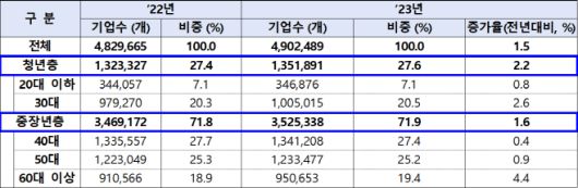 조사 결과 연령별로는 20·30대 청년층 창업기업(135만2000개)이 전년대비 2.2% 증가하며 전체 창업기업 수의 증가율(1.5%)을 상회했다. 2023년 기준 창업기업의 전체 종사자 수는 전체 중소기업 종사자 수(1911만8000명)의 43.6%를 차지하는 833만 명(평균 1.7명)으로 전년대비 2.2% 감소했다. 기술기반업종 창업기업의 전체 종사자 수는 249만900명(평균 2.6명)으로 전체 창업기업 종사자의 30.0%를 차지했다.