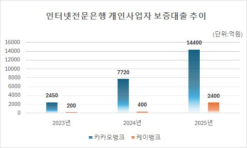 케이뱅크의 개인사업자 보증대출 취급액은 2024년 400억원에서 지난해 2400억원으로 1년 만에 6배 증가했다. 같은 기간 잔액도 1800억원에서 3300억원으로 83.3% 늘었다. 지난해 말 가계부채 관리 강화로 가계대출 총량 증가 한도가 당초 계획대비 50% 축소되면서 개인사업자대출이 증가했다는 분석이다.
