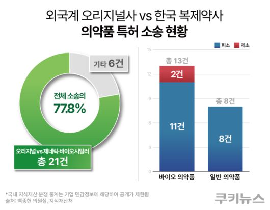 19일 쿠키뉴스가 백종헌 국민의힘 의원실을 통해 입수한 지식재산처 자료에 따르면 2016년부터 2025년 11월까지 최근 10년간 미국에서 발생한 외국 기업과 한국 기업 간 의약품 분야 특허소송은 총 27건으로 집계됐다. 이 가운데 오리지널 제품 특허를 보유한 다국적 제약사와 제네릭·바이오시밀러를 개발하는 한국 회사 간 의약품 분야 특허 소송은 총 21건이다. 제네릭 관련 소송은 8건, 바이오시밀러 관련 소송은 13건이었다.