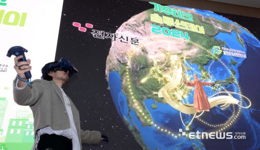 전자신문, 국가녹색기술연구소가 주최한 '기후테크 솔루션데이 2024'가 11일 서울 강남구 한국과학기술회관에서 열렸다. VR아티스트 염동균 착가가 기후테크를 통한 탄소중립 실현을 기원하는 드로잉 퍼포먼스를 선보이고 있다. 김민수기자 mskim@etnews.com |