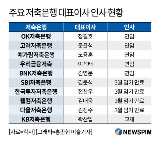 업계 1위 SBI저축은행의 김문석 대표 역시 오는 3월 임기 만료를 앞두고 있다. 업권 안팎에서는 PF 부실 대응 과정에서 조직을 안정적으로 관리해 온 점을 들어 현 체제를 유지할 가능성이 크다는 관측이 우세하다. 이와 함께 전찬우 한국투자저축은행 대표와 김대웅 웰컴저축은행 대표, 김정수 다올저축은행 대표 등도 3월 대표 임기 만료 시점을 맞는 가운데 연임 가능성이 높게 점쳐진다.