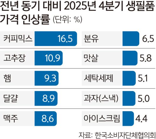 주요 기호식품인 커피믹스가 2024년 4분기 평균 2만7683원에서 2025년 4분기 평균 3만2262원으로 16.5% 가격이 오르며 인상률 1위를 기록했다. 이어 고추장(10.9%), 햄(9.3%), 달걀(8.9%), 맥주(8.6%), 분유(6.5%), 맛살(5.8%), 세탁세제(5.1%), 과자(스낵·5.0%), 아이스크림(4.4%) 등의 순으로 높았다.