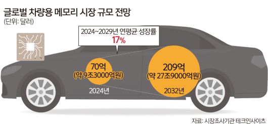 시장조사업체 테크인사이츠는 차량용 메모리 시장 규모가 2024년 70억달러(약 9조3000억원)에서 2032년 209억달러(약 27조9000억원)로 3배 가까이 성장할 것으로 내다봤다.