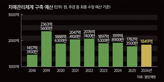 19일 열린재정 재정정보공개시스템에 따르면 치매관리체계 구축 예산(추가경정예산 기준)은 2018년 1457억3100만원에서 2019년 2363억5600만원으로 급증한 뒤 2020년 1888억6300만원, 2021년 2047억4100만원, 2022년 2076억7400만원으로 2000억원 안팎을 기록했다. 하지만 이전 정부 들어 관련 예산이 크게 줄면서 2023년 1897억5300만원, 2024년 1919억8900만원을 나타낸 뒤 2025년에는 1782억3500만원까지 쪼그라들었다. 올해 예산은 1849억원으로 지난해 대비 67억원 정도 증가했지만 여전히 2021, 2022년 수준과 격차가 크다. 치매관리체계 구축사업은 치매 대응의 ‘최전선’인 치매안심센터 운영지원, 공립요양병원 및 치매공공후견 등을 망라한다.