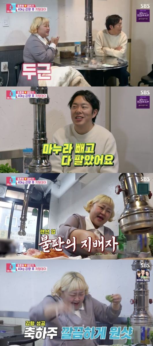 결국 체중 감량에 성공한 홍윤화는 손꼽아 기다리던 치팅데이를 하러 갔다. 홍윤화는 단골로 다니던 흑돼지 식당으로 향했다. 홍윤화는 김민기에게 받은 금팔찌를 자랑했고, 김민기는 “마누라 빼고 다 팔았다”라고 너스레를 떨었다.
