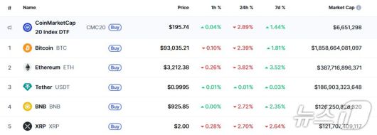 20일 오전 6시 30분 현재 글로벌 코인 시황 중계사이트 코인마켓캡에서 비트코인은 24시간 전보다 2.39% 하락한 9만3035달러를 기록하고 있다. 앞서 비트코인은 9만2089달러까지 추락, 9만3000달러가 붕괴했었다.