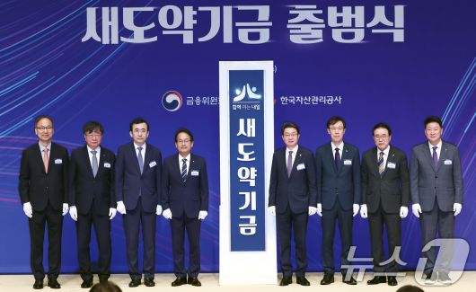 이억원 금융위원장(오른쪽 네번째)이 1일 오전 서울 중구 한국프레스센터에서 열린 새도약기금 출범식에서 정정훈 한국자산관리공사장, 양혁승 새도약기금 대표이사, 강준현 국회 정무위 간사 등 참석자들과 현판 제막을 한 뒤 기념촬영을 하고 있다. 2025.10.1/뉴스1 ⓒ News1 김민지 기자 |