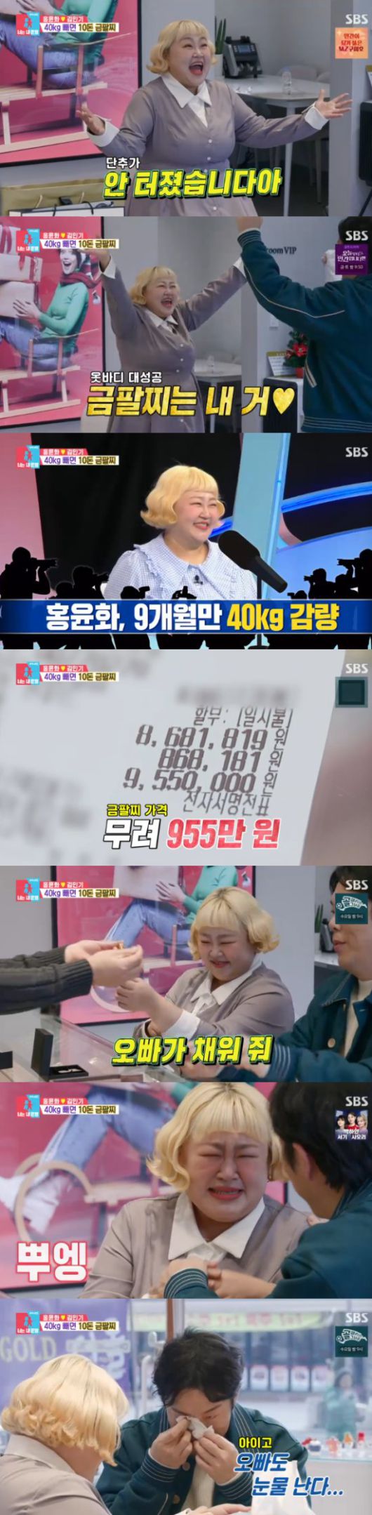 그리고 이날은 홍윤화의 40kg 감량 계체 D-DAY였다. 일단 두 사람은 10돈짜리 금팔찌를 봐뒀던 금은방으로 향했다. 금은방 사장님은 다시 찾은 두 사람의 모습에 "금팔찌를 팔 수 있는 기회가 온거냐"면서 설레했다.