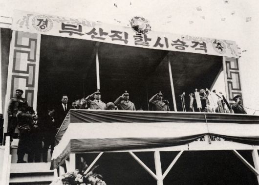 1963년 열린 부산직할시 승격 경축대회 모습. 단상 가운데의 선글라스 낀 인물이 박정희 당시 국가재건최고회의 의장이다. 한국학중앙연구원 홈페이지