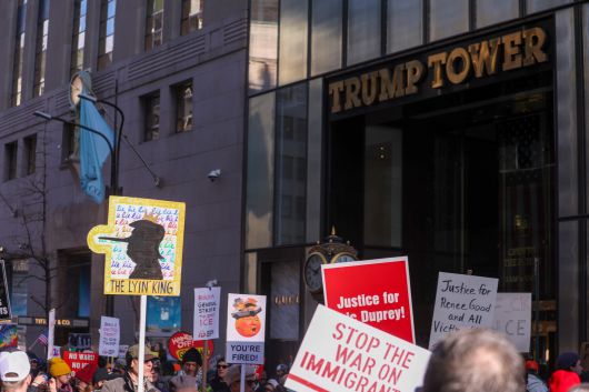 11일 미국 뉴욕에서 열린 시위 도중 사람들이 트럼프 타워 앞에서 플래카드를 들고 행진하고 있다. /연합뉴스 |