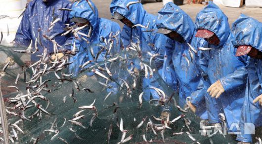 [부산=뉴시스] 하경민 기자 = 25일 오후 부산 기장군 대변항에서 어민과 외국인 노동자들이 갓 잡은 멸치를 그물에서 털어내고 있다. 봄철 기장멸치는 몸길이 10~15㎝로 구이용, 횟감용, 젓갈용 등 다양하게 이용되고 있다. 2025.03.25. yulnetphoto@newsis.com |