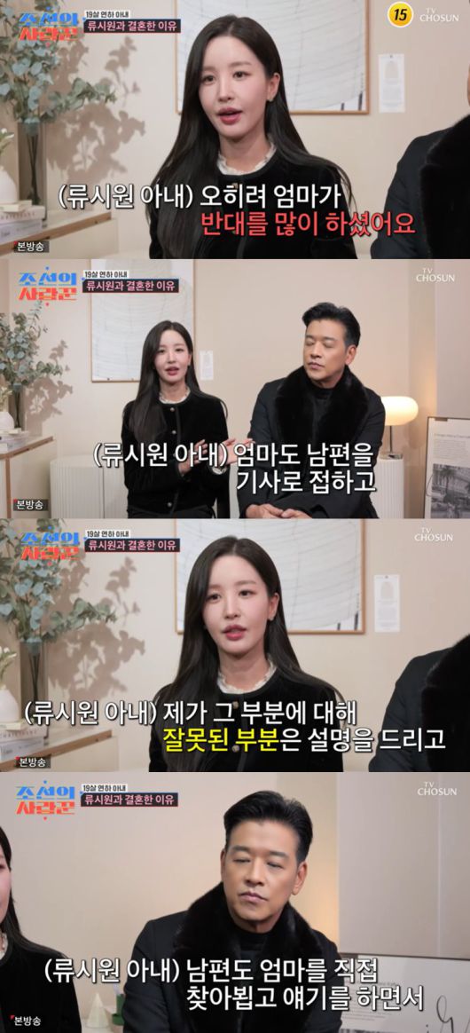 이후 결혼을 둘러싼 가족의 반대에 대해서도 언급했다. 류시원의 아내는 "아빠는 저를 존중해 주셨지만, 엄마는 반대를 많이 하셨다"며 "기사를 통해 사람을 판단하게 되다 보니 엄마가 남편을 기사로 접하고 더 놀라셨던 것 같다"고 설명했다.