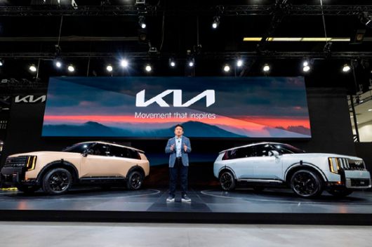 윤승규 기아 부사장이 지난해 11월 20일(현지시간) 미국 로스앤젤레스 LA 컨벤션 센터에서 열린 '2025 LA 오토쇼'에서 신형 텔루라이드에 대해 설명하고 있다. (왼쪽부터) 신형 텔루라이드 오프로드 특화 모델 X-Pro, 신형 텔루라이드 하이브리드. [사진=기아] |