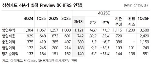 윤 연구원은 “4Q25(2025년 4분기) 당기순이익 1400억원(전년 동기 대비 +5.2%)으로 컨센서스 부합을 추정한다. 매 4분기에 인식하는 경기전망충당금은 제한적인 영향”이라며 “신용판매는 수익 6595억원(+5.8%)을 추정한다. 전 분기에 이어 개인신판 M/S(시장점유율) 2위를 유지하고 스타벅스, KTX, 번개장터 등 30개가 넘는 브랜드와 제휴한 PLCC 카드판매를 통해 포트폴리오를 확장했다”고 분석했다.