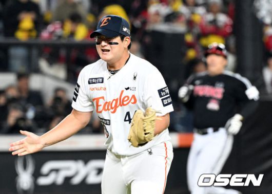[OSEN=대전, 이대선 기자] 30일 대전 한화생명볼파크에서 2025 신한 SOL Bank KBO리그 포스트시즌 한국시리즈 4차전 한화 이글스와 LG 트윈스의 경기가 열렸다.이날 경기에 한화는 와이스를, LG는 치리노스를 선발투수로 내세웠다. 8회초 2사 1,2루에서 한화 김서현이 LG 오스틴을 플라이로 처리하고 환호하고 있다. 2025.10.30 /sunday@osen.co.kr |