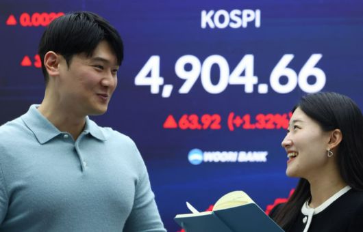 코스피가 전 거래일(4840.74)보다 63.92포인트(1.32%) 오른 4904.66에 마감한 지난 19일 오후 서울 중구 우리은행 본점 딜링룸에 지수가 표시돼 있다. 뉴시스 |