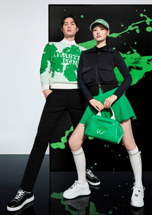 여자 모델은 시크한 올 블랙 상의에 채도 높은 그린 플리츠 스커트와 글로시한 로고 토트백을 매치해 경쾌하면서도 강렬한 골프 패션을 연출했다. 특히 입체 포켓 디테일이 돋보이는 집업 베스트는 트렌디한 유틸리티룩을 연상시킨다.