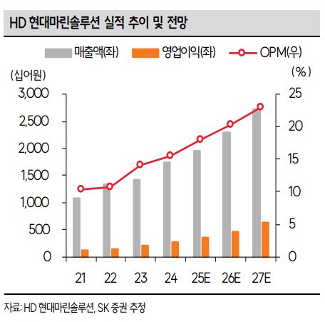 SK증권은 20일 HD현대마린솔루션에 대해 4분기 시장 기대에 부합하는 실적을 기록한 가운데, AM·친환경·디지털 솔루션의 중장기 성장성과 오버행 우려 완화를 고려하면 현 주가 수준은 매수 기회라며 투자 의견을 '매수'로 유지하지만 목표 주가는 27만 원으로 하향했다.