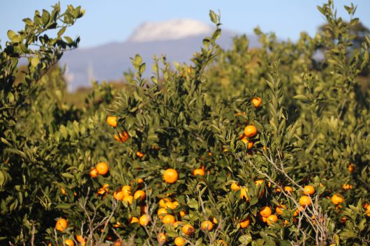 지난 6일 제주 서귀포시 남원읍에 있는 감귤밭 뒤로 보이는 한라산 정상에 눈이 쌓여 있다. 연합뉴스 |