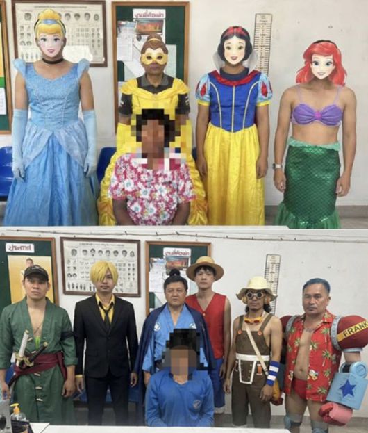 [스포츠조선 장종호 기자] 태국 경찰이 백설공주, 인어공주 등 디즈니 만화 캐릭터 의상을 입고 범죄 용의자와 함께 직은 사진이 화제다.