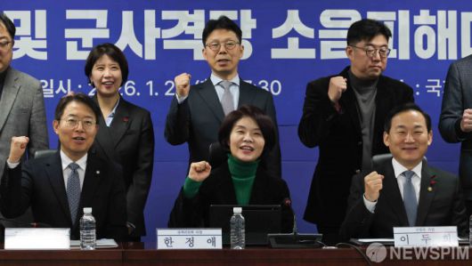 [서울=뉴스핌] 윤창빈 기자 = 한정애 더불어민주당 정책위의장, 이두희 국방부 차관 등 참석자들이 20일 서울 여의도 국회 의원회관에서 열린 군용비행장 및 군사격장 소음피해대책 관련 당정협의에서 기념촬영을 하고 있다. 2026.01.20 pangbin@newspim.com