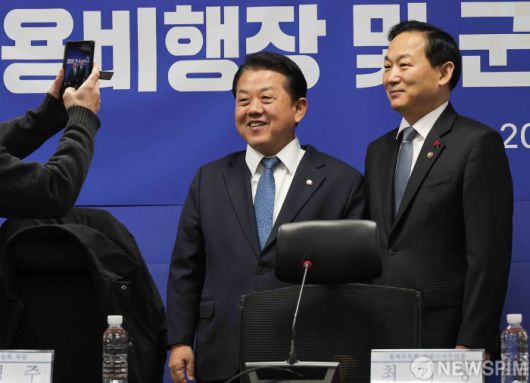 [서울=뉴스핌] 윤창빈 기자 = 김병주 더불어민주당 의원, 이두희 국방부 차관이 20일 서울 여의도 국회 의원회관에서 열린 군용비행장 및 군사격장 소음피해대책 관련 당정협의에서 기념촬영을 하고 있다. 2026.01.20 pangbin@newspim.com