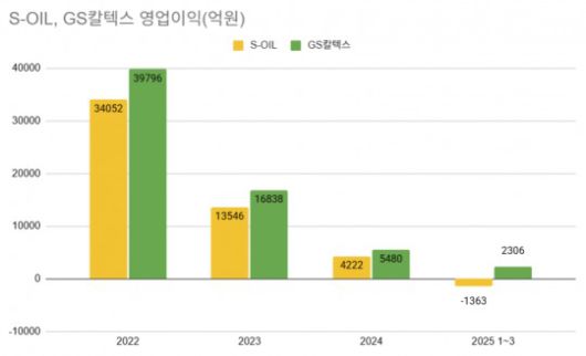 GS칼텍스와 에쓰오일은 같은 정유업계에 속해 유사한 실적 흐름을 보인다. GS칼텍스 영업이익은 ▲2022년 3조9796억원 ▲2023년 1조6838억원 ▲2024년 5480억원 ▲2025년 1~3분기 2306억원을 기록했다. 에쓰오일도 ▲2022년 3조4052억원 ▲2023년 1조3546억원 ▲2024년 4222억원 ▲2025년 1~3분기 영업손실 1363억원으로 하락 추세다. 공통적으로 2022년 러시아·우크라이나 전쟁 발발로 인한 유가 급등 특수를 누렸으나, 이후 글로벌 수요 둔화 영향을 받고 있다. 지난해엔 상반기 유가 급락으로 대규모 적자를 냈다가, 글로벌 공급 차질 우려 등으로 인한 제품 가격 상승으로 반등하는 '상저하고' 흐름을 보였다.