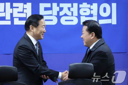 (서울=뉴스1) 신웅수 기자 = 김병주 더불어민주당 의원과 이두희 국방부 차관이 20일 서울 여의도 국회 의원회관에서 열린 군용비행장 및 군사격장 소음피해대책 관련 당정협의에서 인사하고 있다. 2026.1.20/뉴스1phonalist@news1.krCopyright ⓒ 뉴스1. All rights reserved. 무단 전재 및 재배포, AI학습 이용 금지.