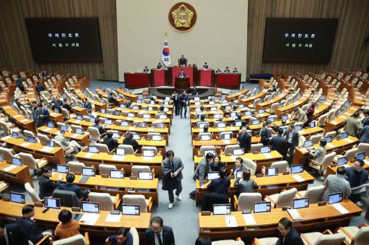 국회에서 열린 12월 임시국회 본회의에서 국민의힘 서범수 의원이 경찰관 직무집행법 일부개정법률안에 대해 무제한 토론을 시작하자 대부부분 의원들이 본회의장을 떠나고 있다. |