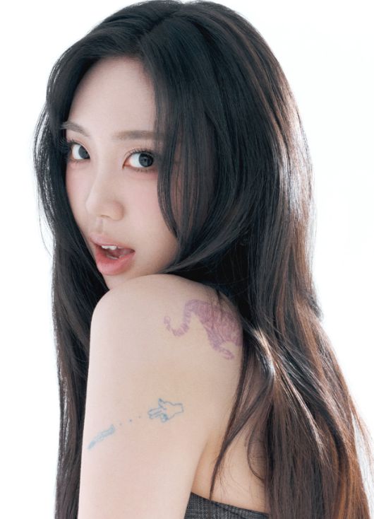 요프숄더 트렌치 드레스를 입은 컷에서는 매끈한 쇄골 라인이 돋보이며 청순과 도발을 넘나드는 콘셉트를 자연스럽게 소화, 그동안 무대 위에서 보여준 힙합 이미지와는 또 다른 반전 매력을 선보였다.