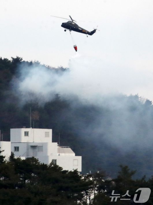 (울산=뉴스1) 윤일지 기자 = 20일 오전 울산 울주군 삼남읍 교동리 작천정계곡 인근에서 산불이 나 산불 진화 헬기가 진화 작업을 벌이고 있다. 2026.1.20/뉴스1