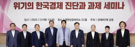 31일 서울 중구 대한상공회의소에서 열린 경제8단체 공동 '위기의 한국경제 진단과 과제' 세미나에서 박일준 대한상의 상근부회장(오른쪽 네번째)과 참석자들이 기념촬영을 하고 있다. [사진=연합뉴스] |