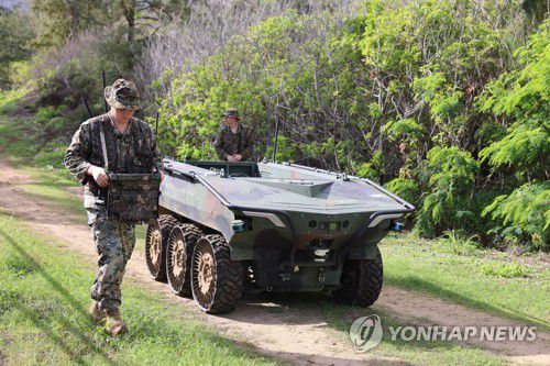 한화에어로스페이스의 다목적 무인차량 '아리온스멧'을 운용하는 미 해병대원 |