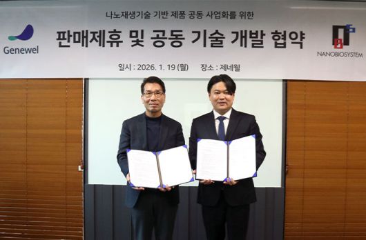 또 양사는 제네웰의 의료기기, 코스메틱 제품에 나노바이오시스템의 나노 재생 파티클 기술 적용을 통한 에스테틱 신제품 개발도 함께 검토할 예정이다.