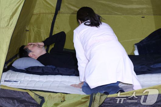(서울=뉴스1) 신웅수 기자 = 장동혁 국민의힘 대표가 20일 서울 여의도 국회 로텐더홀에 마련된 단식 농성장에서 건강 상태를 확인하고 있다. 2026.1.20/뉴스1phonalist@news1.krCopyright ⓒ 뉴스1. All rights reserved. 무단 전재 및 재배포, AI학습 이용 금지.
