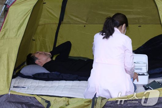 (서울=뉴스1) 신웅수 기자 = 장동혁 국민의힘 대표가 20일 서울 여의도 국회 로텐더홀에 마련된 단식 농성장에서 건강 상태를 확인하고 있다. 2026.1.20/뉴스1