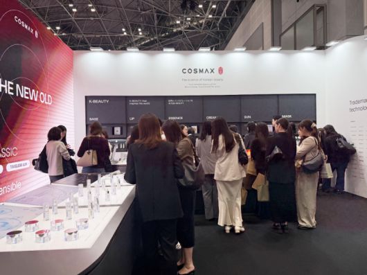 지난 14일부터 16일까지 일본 도쿄에서 개최된 ‘코스메위크 도쿄 2026’에 마련한 코스맥스 부스를 업계 관계자들이 살펴보고 있다.[사진=코스맥스] |