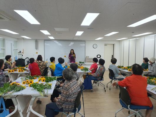 밝은 조명 아래 여러 사람이 테이블에 앉아 꽃꽂이 수업을 듣고 있는 사진이다. 강사가 꽃을 들고 설명하고 있으며, 테이블 위에는 해바라기와 꽃꽂이 도구들이 놓여 있다. |