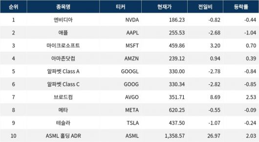 엔비디아(NVDA)는 186.23 달러로 보합세를 나타냈다. 알파벳 Class A(GOOGL)와 Class C(GOOG)는 각각 0.84% 및 0.85% 하락했다. 브로드컴(AVGO)은 351.71 달러로 2.53% 상승하며 강세를 보였다.