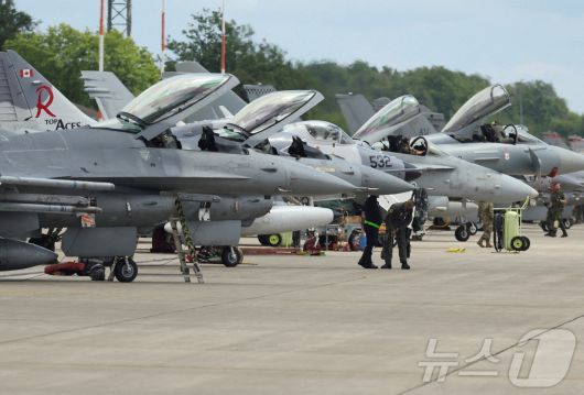 (람슈타인 로이터=뉴스1) 이창규 기자 = 독일 람슈타인의 미국 공군 기지 격납고 앞에 서 있는 전투기. 2024.6.6./뉴스1 ⓒ 로이터=뉴스1 Copyright ⓒ 뉴스1. All rights reserved. 무단 전재 및 재배포, AI학습 이용 금지.