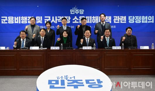 아시아투데이 이병화 기자 = 한정애 더불어민주당 정책위의장과 이두희 국방부 차관을 비롯한 참석자들이 20일 국회 의원회관에서 열린 군용비행장 및 군사격장 소음피해대책 관련 당정협의에서 기념촬영을 하고 있다. ⓒ "젊은 파워, 모바일 넘버원 아시아투데이"