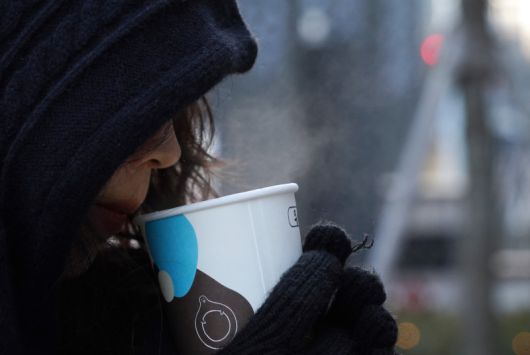 서울 전역에 한파주의보가 발효된 20일 오전 구로구 가산디지털단지 인근에서 한 시민이 따뜻한 음료를 마시며 출근하고 있다. |