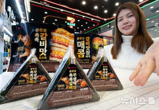 세븐일레븐이 윤나라와 협업해 다음 달 3일부터 선보이는 푸드 간편식은 ▲윤주모촉촉갈비무생채삼각김밥 ▲윤주모촉촉갈비맛토스트 ▲윤주모매콤갈비맛쌈버거 등 3종이다.