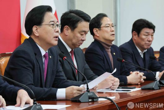 [서울=뉴스핌] 윤창빈 기자 = 송언석 국민의힘 원내대표가 20일 서울 여의도 국회에서 열린 원내대책회의에서 모두발언을 하고 있다. 2026.01.20 pangbin@newspim.com