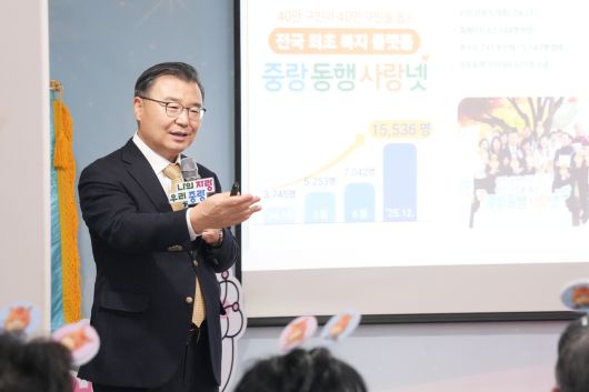 류경기 중랑구청장이 마이크를 들고 오른손을 뻗어 보이는 모습이다. 배경에는 ‘전국 최초 복지 플랫폼, 중랑 동행 사랑넷’이라는 텍스트와 그래프, 여러 사람들의 모습이 흐릿하게 보인다. |