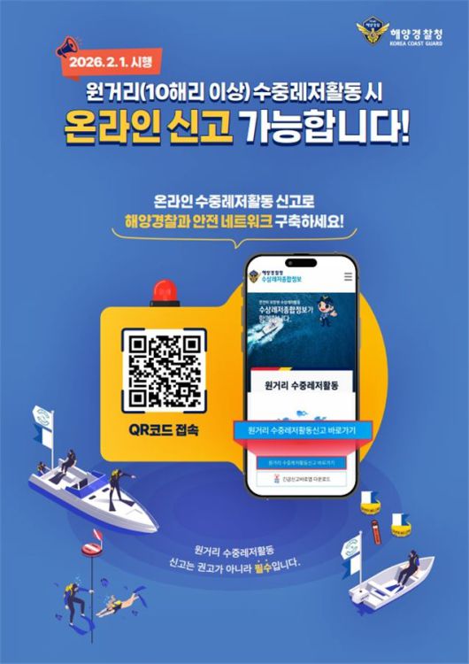 해경 관계자는 "개편된 신고 체계를 통해 원거리 수중레저 활동의 안전 관리 수준이 한층 강화될 것"이라며 "이용자들도 반드시 사전 신고를 통해 안전한 레저 활동에 동참해 달라"고 당부했다.