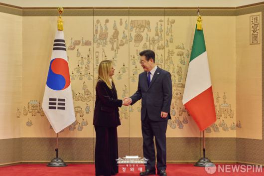 [서울=뉴스핌] 이재명 대통령이 지난 19일 서울 청와대에서 조르자 멜로니 이탈리아 총리와 정상회담을 앞두고 악수를 하고 있다. [사진=청와대] 2026.01.20 photo@newspim.com