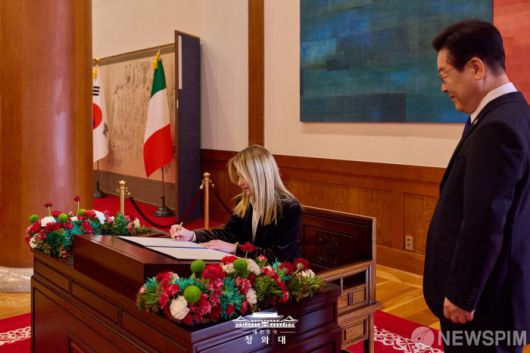[서울=뉴스핌] 조르자 멜로니 이탈리아 총리가 지난 19일 서울 청와대에서 한-이탈리아 정상회담을 앞두고 방명록을 작성하고 있다. [사진=청와대] 2026.01.20 photo@newspim.com