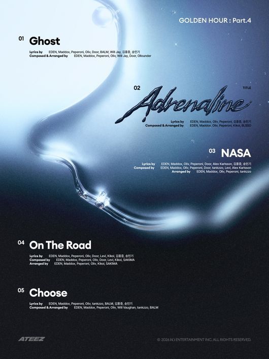 트랙리스트에 따르면 에이티즈의 새 앨범 타이틀곡은 '아드레날린(Adrenaline)'이다. 이 외에도 '고스트(Ghost)', '나사(NASA)', '온 더 로드(On The Road)', '츄즈(Choose)'까지 총 5곡이 수록돼 '골든 아워' 시리즈의 빛나는 서사를 이어갈 예정이다.