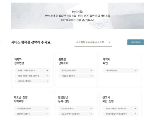 My 자이는 자이 아파트 계약 고객 전용 온라인 서비스로 △계약 변경·정정 △중도금 및 잔금 납부 △환불 신청 △소유권 이전 등기 관련 서류 접수까지 한 화면에서 처리할 수 있도록 설계됐다. 전화나 현장 창구 중심의 기존 방식에서 벗어나 고객이 직접 계약 전 과정을 관리할 수 있는 점이 특징이다.